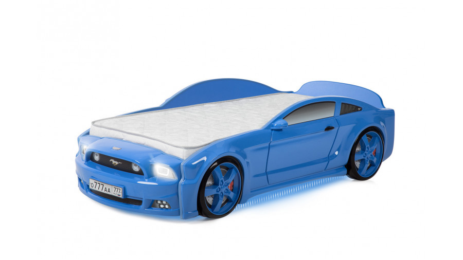 Машинка-кроватка «Мустанг» 3D чудесного синего цвета выполнена в объемном дизайне.