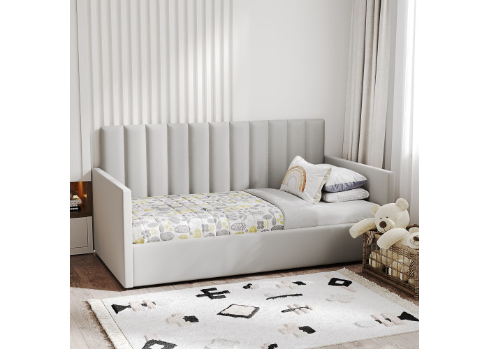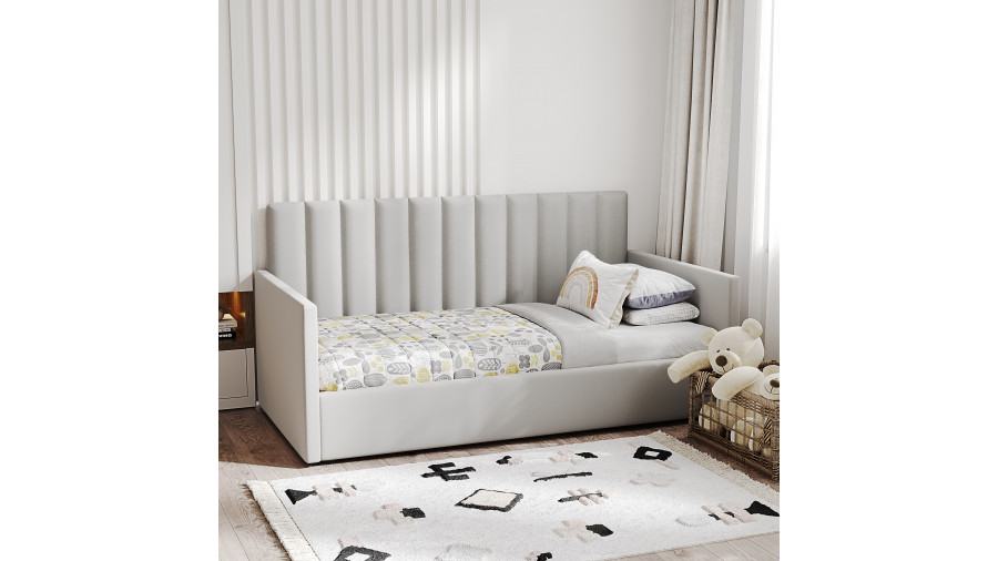 1-спальная кровать имеет удобный подъемный механизм с вместительным местом для хранения пастельного белья или других вещей. Кровать-тахта с надежной ортопедической решеткой выдерживает вес до 120 кг, что делает ее универсальной для сна ребенка или взрослого человека. Кровать с высоким изголовьем и мягкой обивкой в современном дизайне впишется в любой интерьер комнаты, добавляя ей стиля и комфорта.