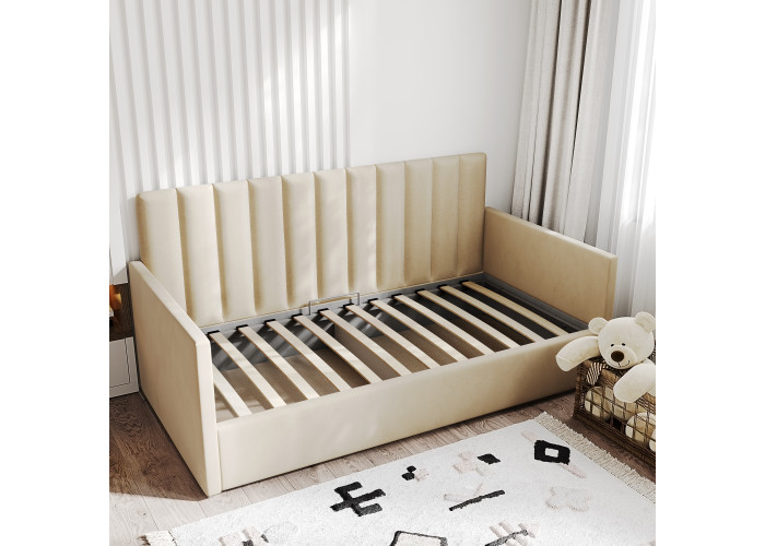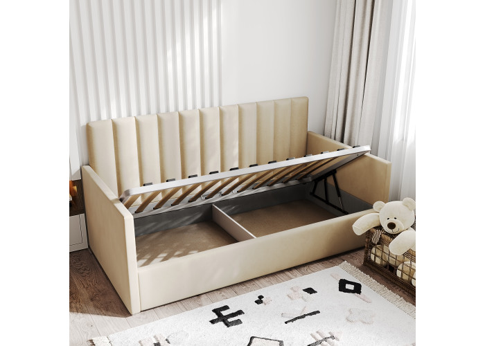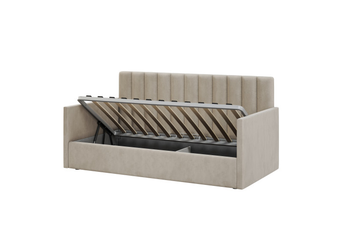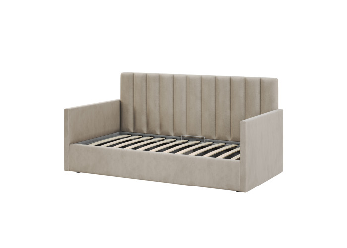 1-спальная кровать имеет удобный подъемный механизм с вместительным местом для хранения пастельного белья или других вещей. Кровать-тахта с надежной ортопедической решеткой выдерживает вес до 120 кг, что делает ее универсальной для сна ребенка или взрослого человека. Кровать с высоким изголовьем и мягкой обивкой в современном дизайне впишется в любой интерьер комнаты, добавляя ей стиля и комфорта.